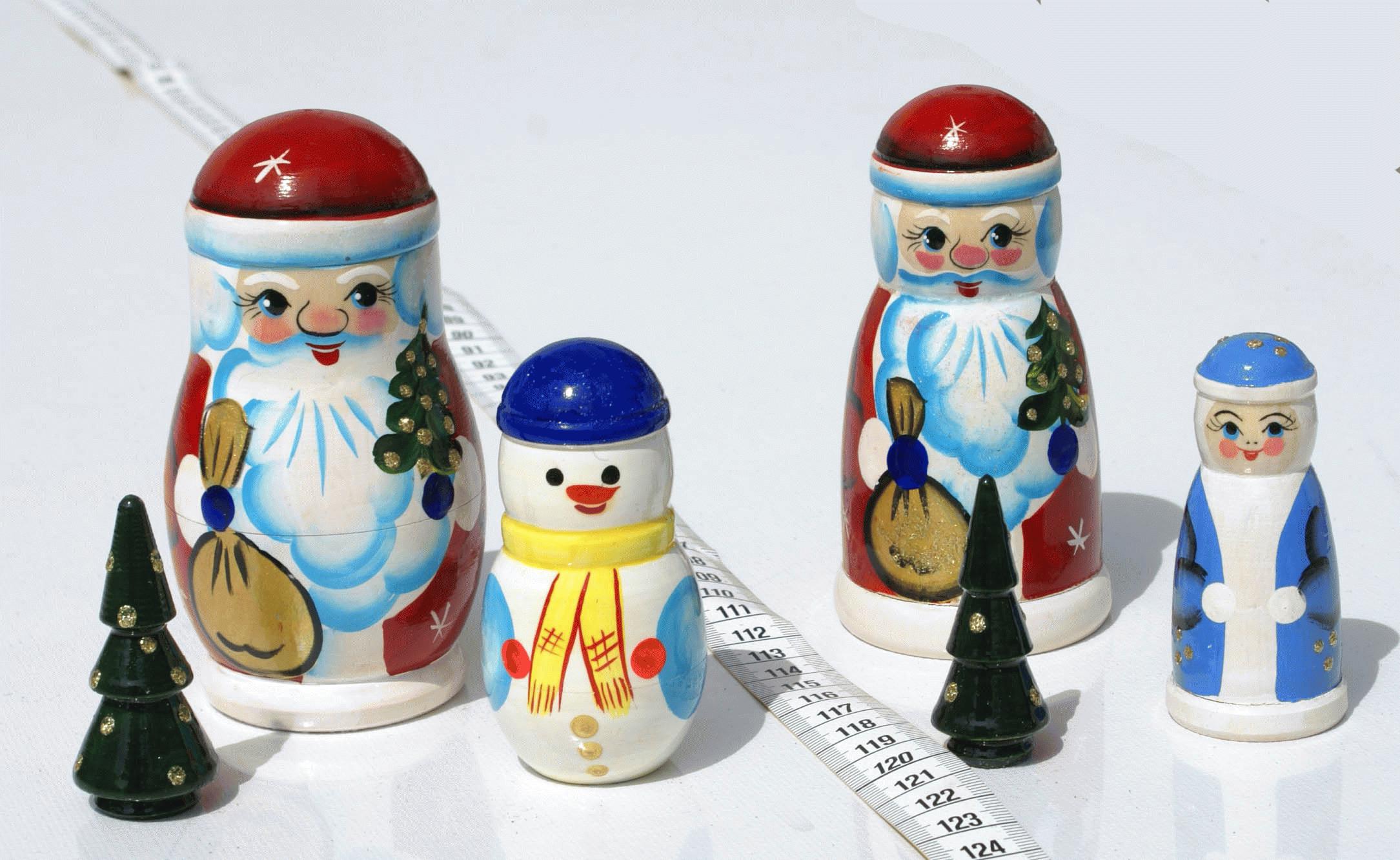 冬の祝祭をテーマにした3ピースの木製入れ子人形セットです。最大の人形には、赤い帽子に青と白のコート、金彩アクセントを施したサンタクロースが描かれ、側面には小さなクリスマスツリーが彩色されています。中には青い帽子と黄色いマフラーの雪だるま、さらに青白い冬のキャラクターが続きます。写真の通り、彩色された小さなモミの木2本が付属します。最大サイズは約11 cm。光沢ラッカー仕上げ。写真に写っている3ピース1セットです。